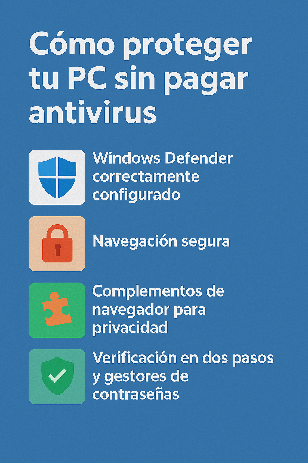 ✅ Seguridad: Windows Defender, Malwarebytes o Bitdefender.